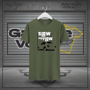 La base es una playera roja, un color que no se esconde y que le da un pop increíble al diseño. El gráfico central es el que se lleva toda la atención: un auto deportivo clásico, con una silueta minimalista y limpia, enmarcado por un logo que grita «Garage Volks» con una tipografía que te recuerda de inmediato a los juegos más icónicos de la calle, como el «GTA».